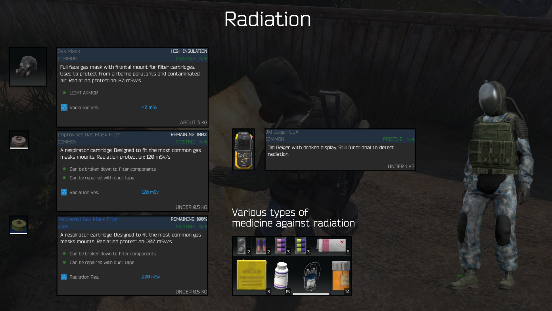 Radiation system is a separate server side plugin implemented in DayZ enforce scripting language that adds new gameplay mechanics related to the exposure of the environmental threats like Radiation and Chemical contamination. The systems provide a full logic of new types of diseases and symptoms that affect the player. We also implemented various types of protective gear and items that help the player to survive in these harsh conditions.