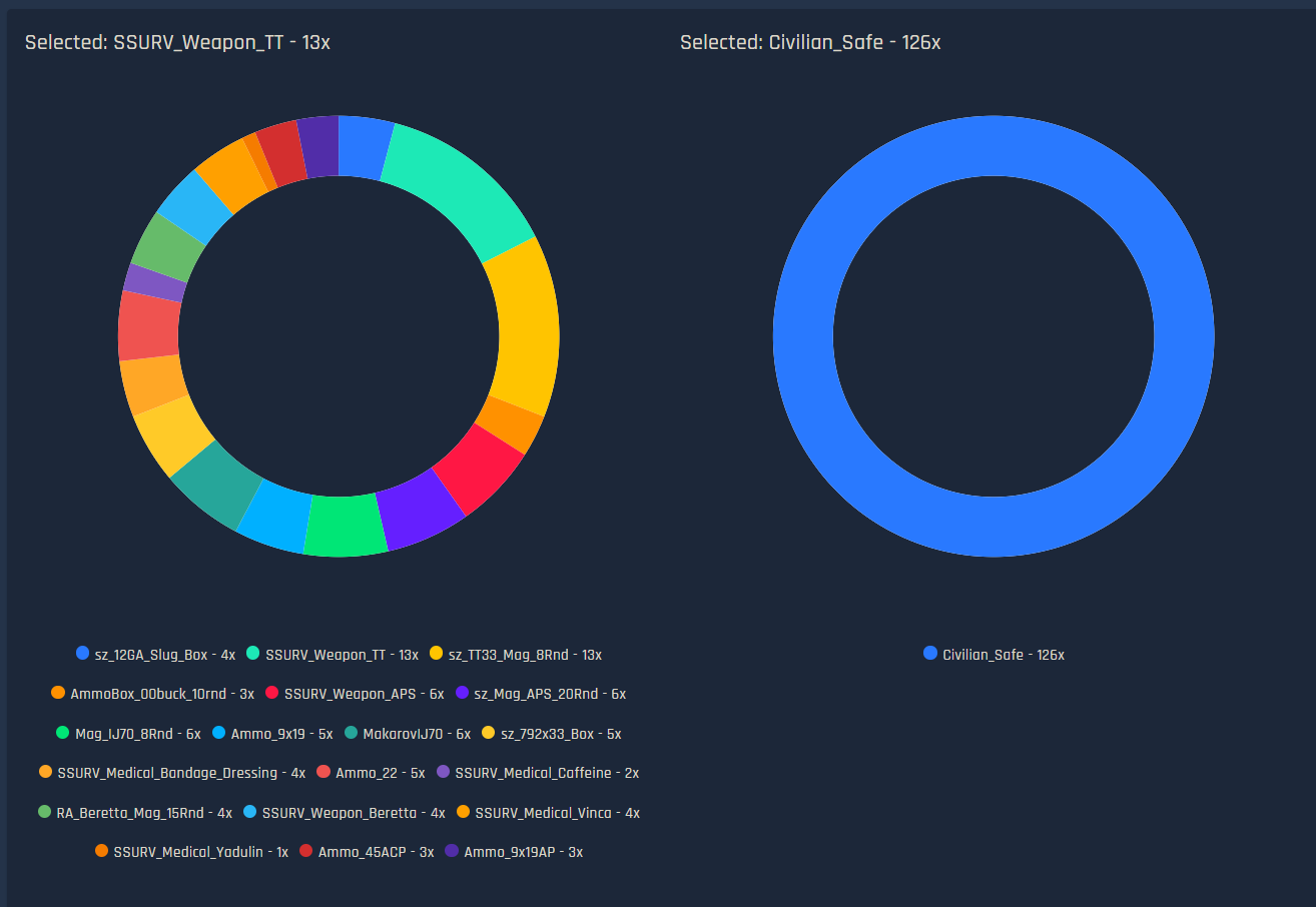 I wanted to have the loot under control and the vanilla approach of pre-spawned loot on the ground for DayZ is decent, but very limited in terms of flexibility and scalability. So we offloaded the actual loot pool on the API side and created a flexible loot configuration with a lot of modifiers (spawn chance, count, variants, categories). We can also affect the loot based on custom conditions like player reputation, currently active quests and many other factors.